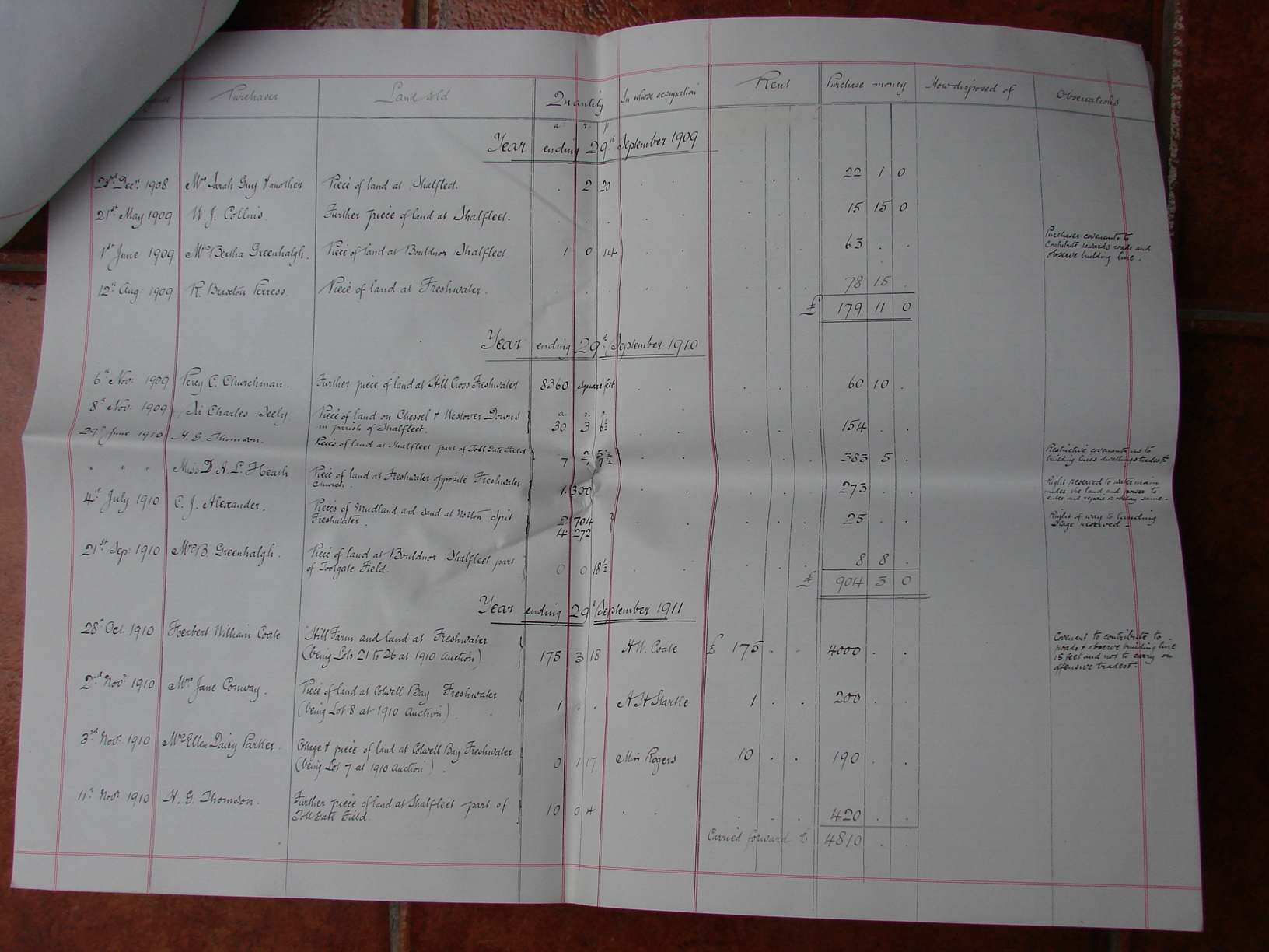 Handwritten details of sales for the Isle of Wight estate