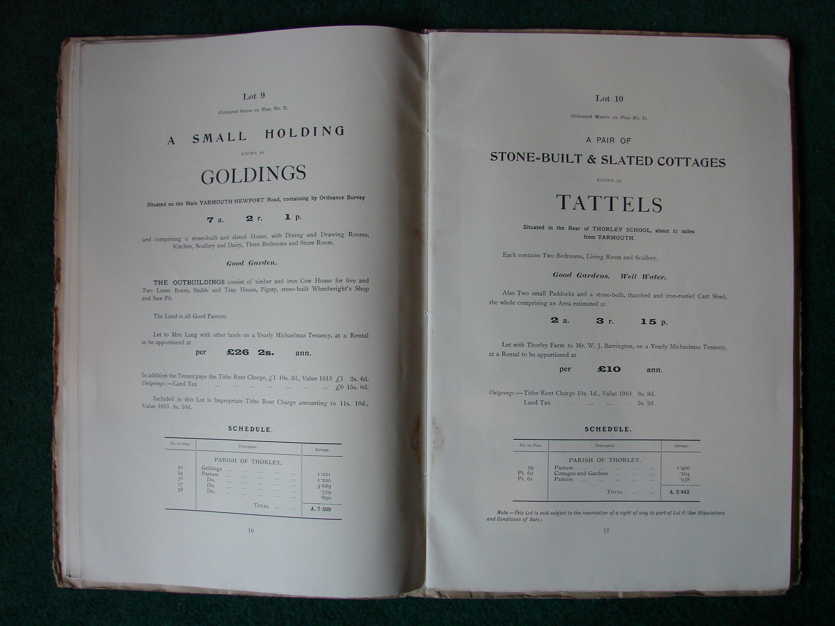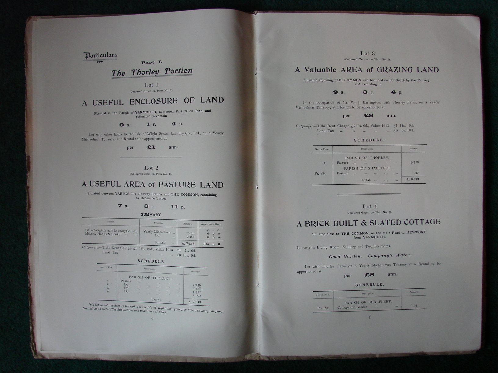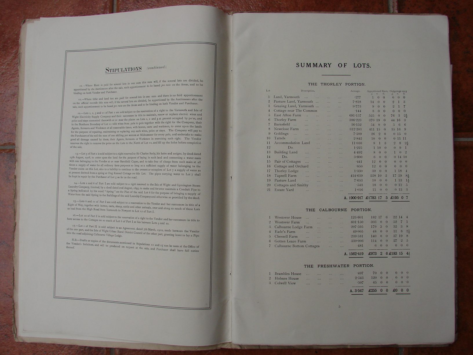 Printed list of sale particulars for Thorley. Freshwater and Calbourne.